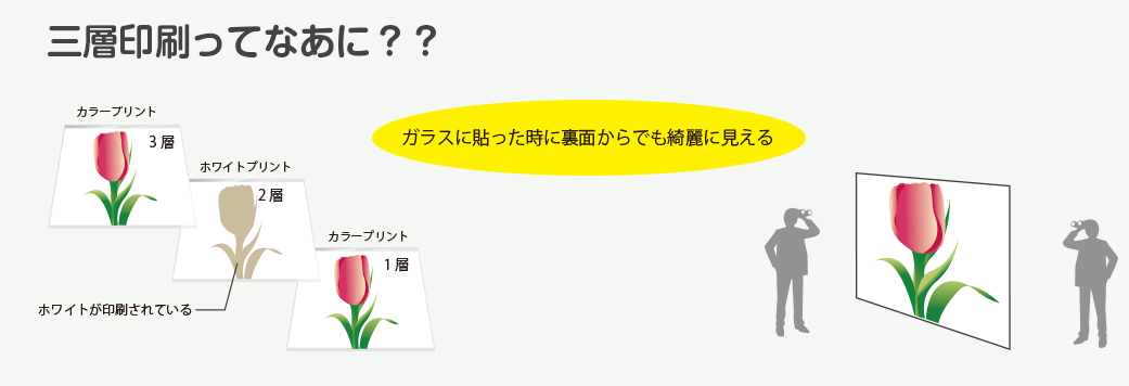 カラープリント→ホワイトインク→カラープリントの順番でプリントを行うことでガラスに貼った際に両面にプリントされた状態になります。