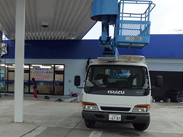 看板施工時はもちろん、高い場所での電球交換などのアフターサービスでも高所作業車を使用いたします。